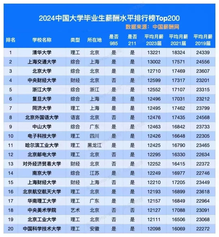 这张图片中的数据来源于中国薪酬网发布的《2024年全国高校毕业生薪酬排行榜TOP200》,这是一家专注于全国各行业各地区薪酬的机构,可信度相对比较高。